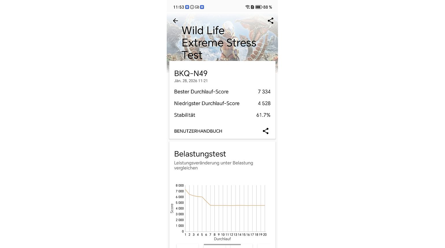 Die aktuellen Preise für Hardware sind derzeit nicht gerade konsumentenfreundlich. Insofern lohnt es sich aber vielleicht, gleich zum besten zu greifen. Diese Überlegung könnte beim Honor Magic8 Pro eine Rolle gespielt haben: Das gute Stück wird vom aktuell schnellsten Android SoC Qualcomm Snapdragon 8 Elite Gen 5 betrieben.Dazu kommen 12 GB Arbeitsspeicher, schneller UFS 4.1 Speicher und Unterstützung für alle WLAN Frequenzen inkl. WiFi 7. Der neue SoC liefert im Smartphone eine sehr gute Figur ab: Auch bei länger laufenden High-Performance Benchmark Test wie 3DMark Wild Life Extreme (Download Android) werden über die Zeit sehr stabile Werte erreicht. Dabei wird das Smartphone auch nicht unangenehm warm oder heiß. Soll heißen: Das Magic8 Pro ist nicht nur gut für den Alltag, sondern ebenso für viele andere Spielereien.